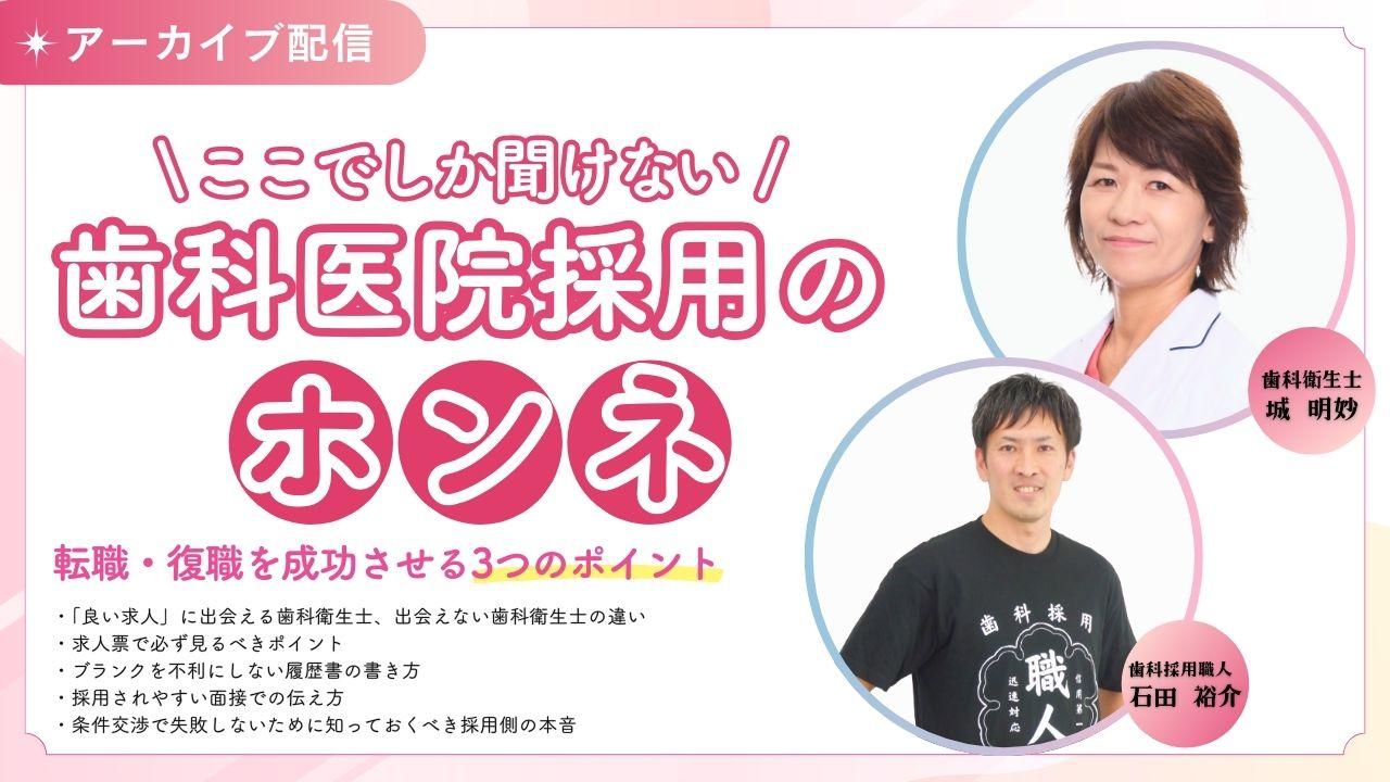 【アーカイブ配信中】 1/20(火)に実施したオンラインセミナーの「ここでしか聞けない歯科医院採用のホンネ~復職・転職を成功させる3つの成功ポイント~」のアーカイブ配信を開始いたしました。 ➡ご視聴はこちら |